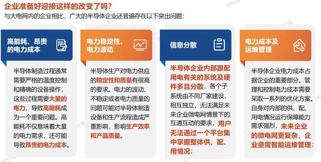 面向 “雙碳" 目標與半導體產業國產化的深化推進,半導體企業在規模擴張與精密生產中面臨的能源管理挑戰愈發凸顯,從電力穩定性保障到能效成本管控,從多系統數據融合到微電網智能運維,每一項需求都關乎企業的核心競爭力與可持續發展。